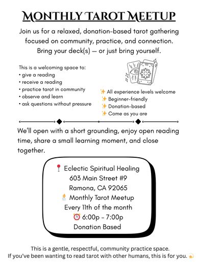 If you have been interested in learning more about certain magical topics and more about divination, be sure to join us for our next meeting. We meet twice a month for 2 hours each time. Join us every other Thursdays 630p-730. $10 per person.